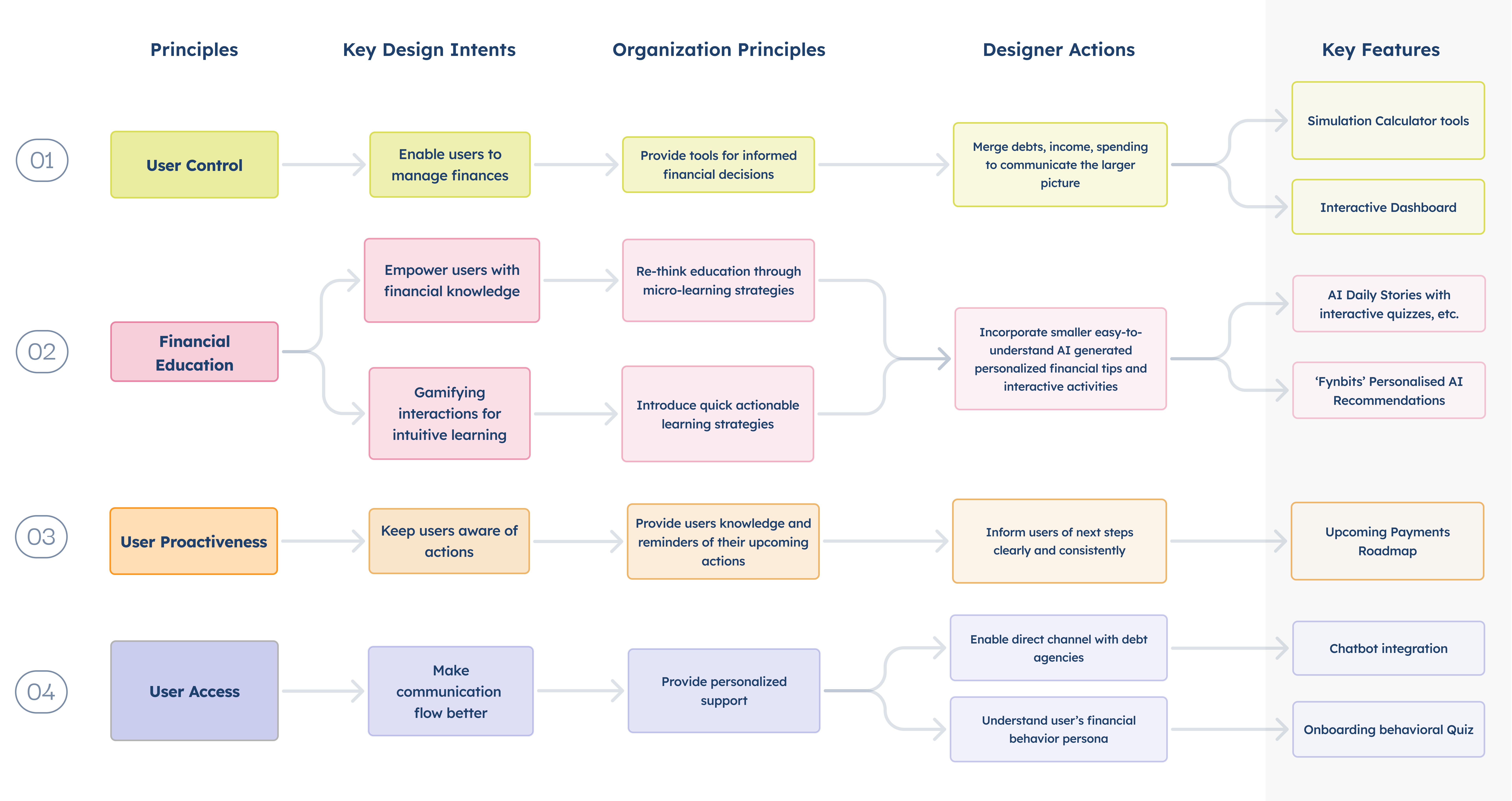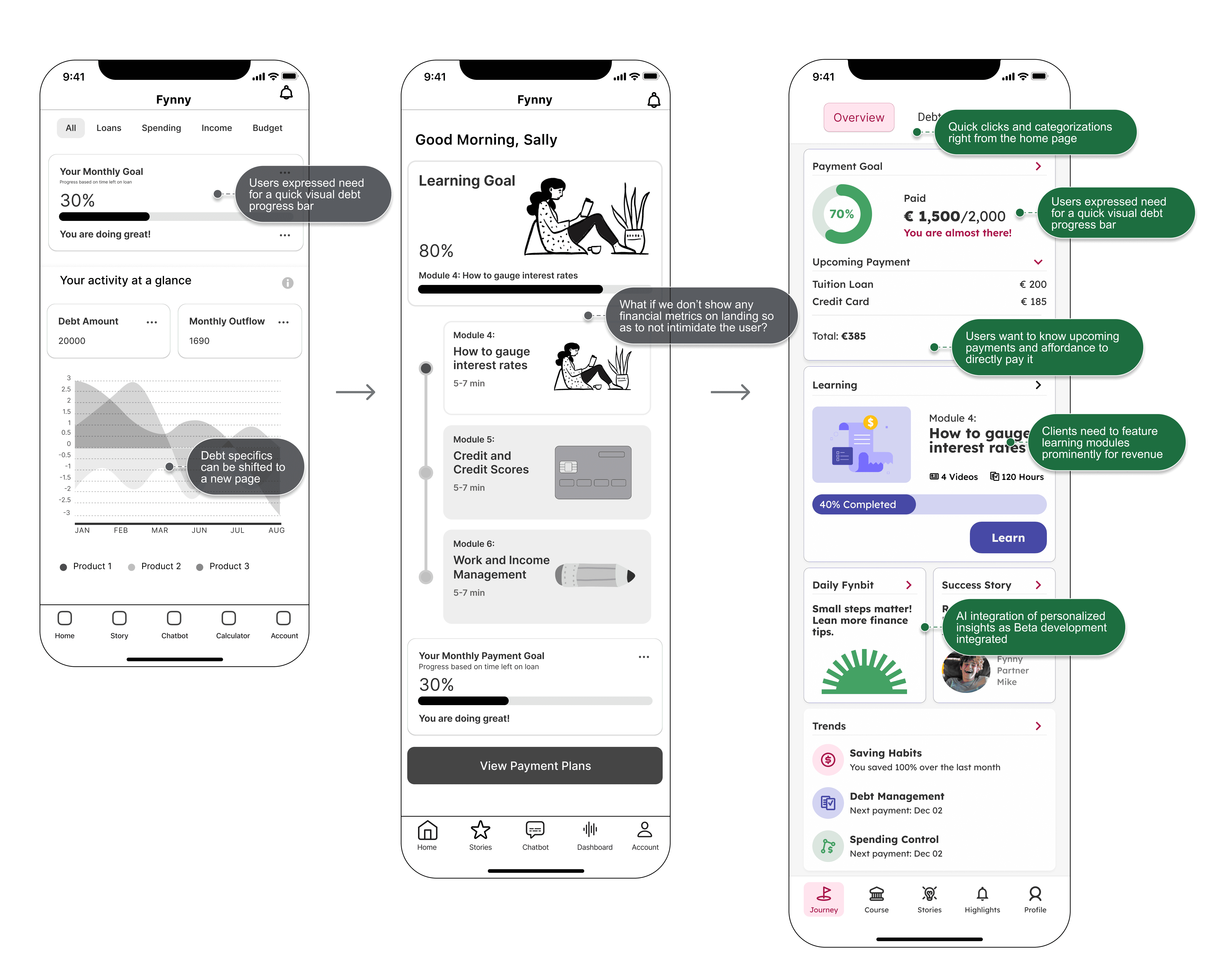 The main question arose on how to concise the elaborate research insights, Fynny's goals, our design prioritizations to the user's benefits to strategize Fynny's feature library and its MVPs.