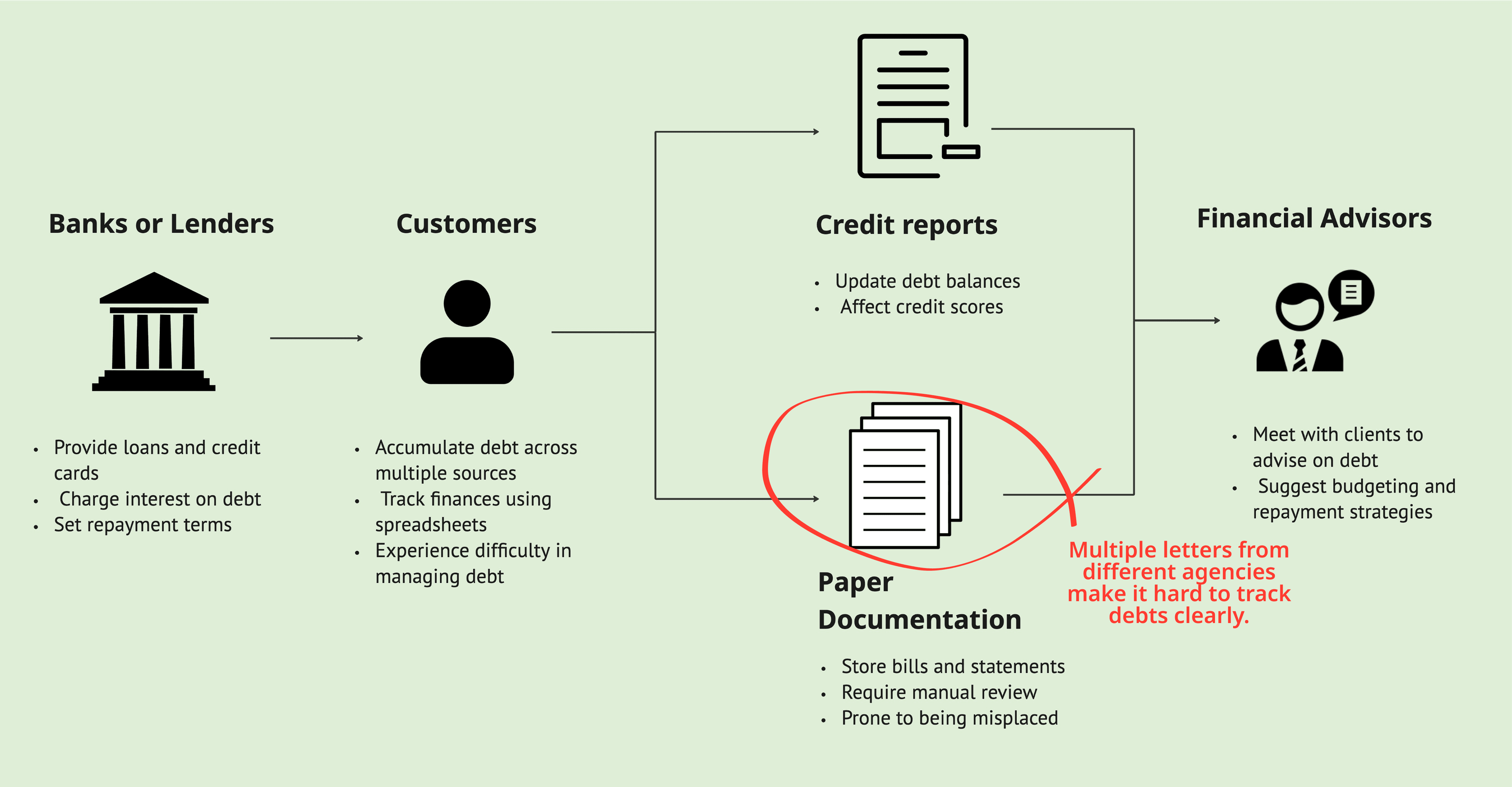 Our first step was to map the entire ecosystem of how users currently manage debt. We found: