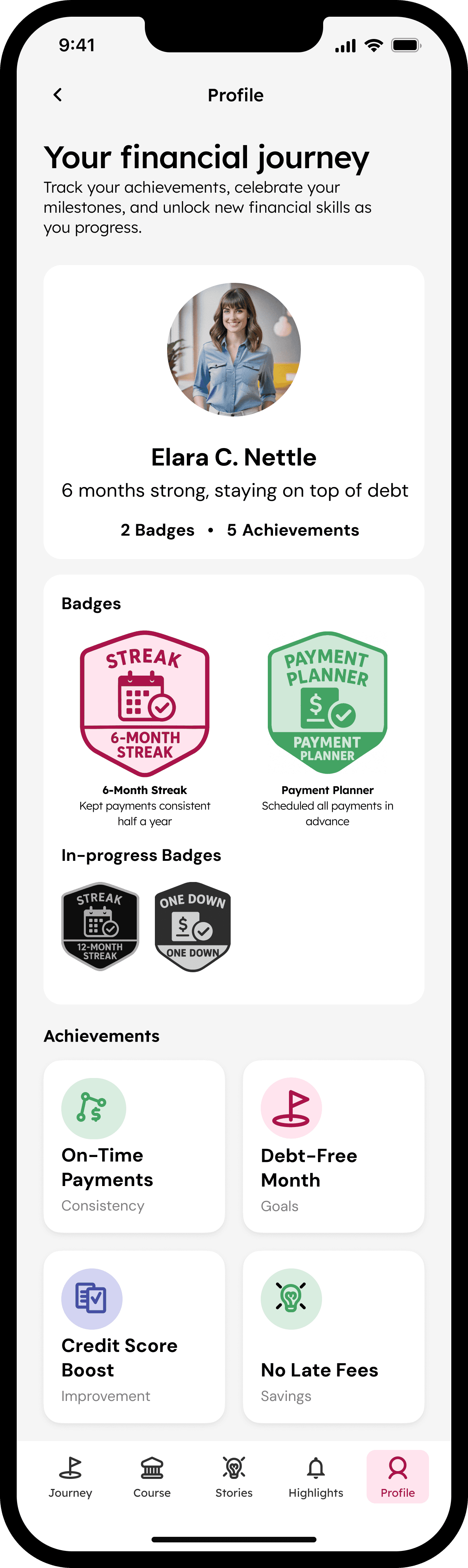 Users earn badges like "6-Month Streak" and "Payment Planner" for consistent, on-time payments, building financial discipline over time.