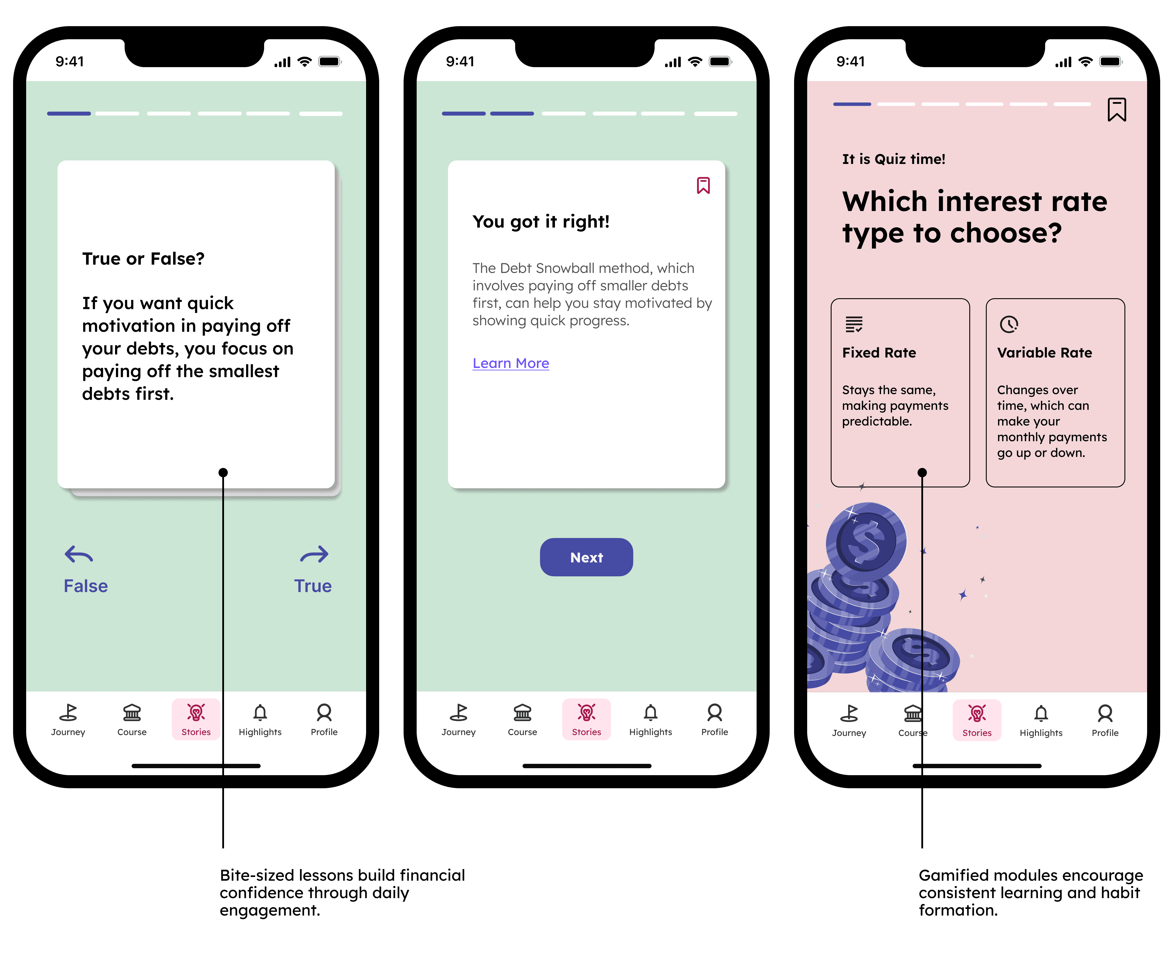 Bite-sized, gamified content that makes financial literacy feel achievable.